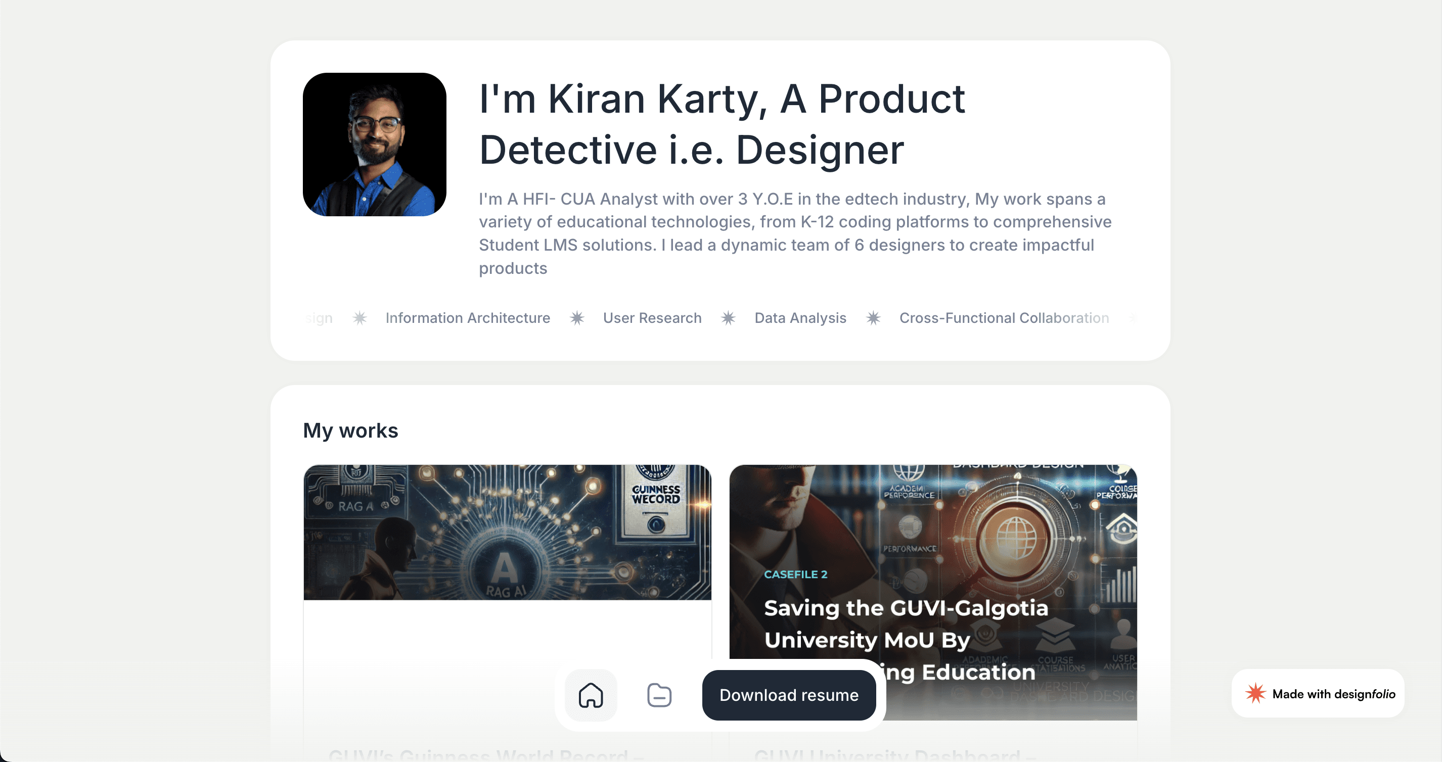 Kiran Karty’s portfolio is a sleek and professional showcase of his design work. The site features a clean layout, bold typography, and a focus on user experience.