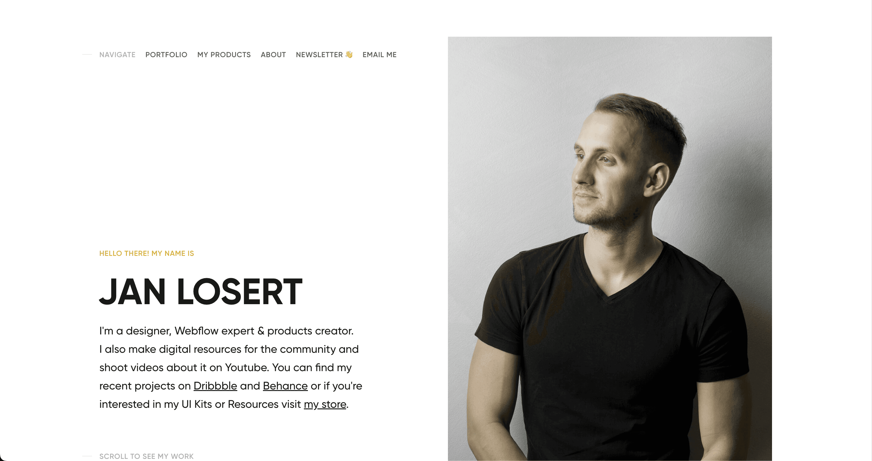 Jan Losert’s portfolio is a sleek and modern showcase of his Webflow design skills. The site features a clean layout, smooth animations, and a focus on user experience.