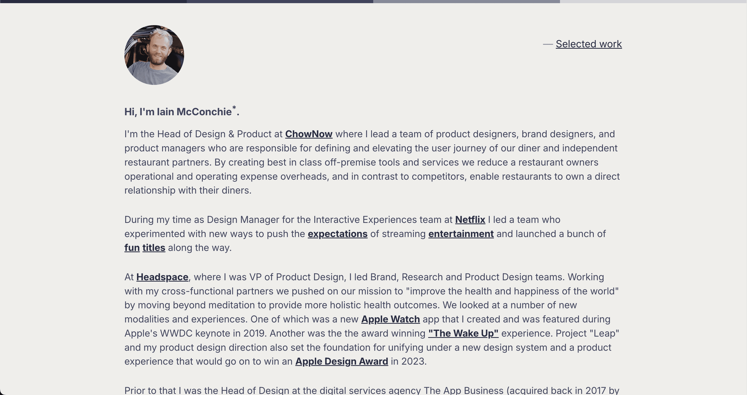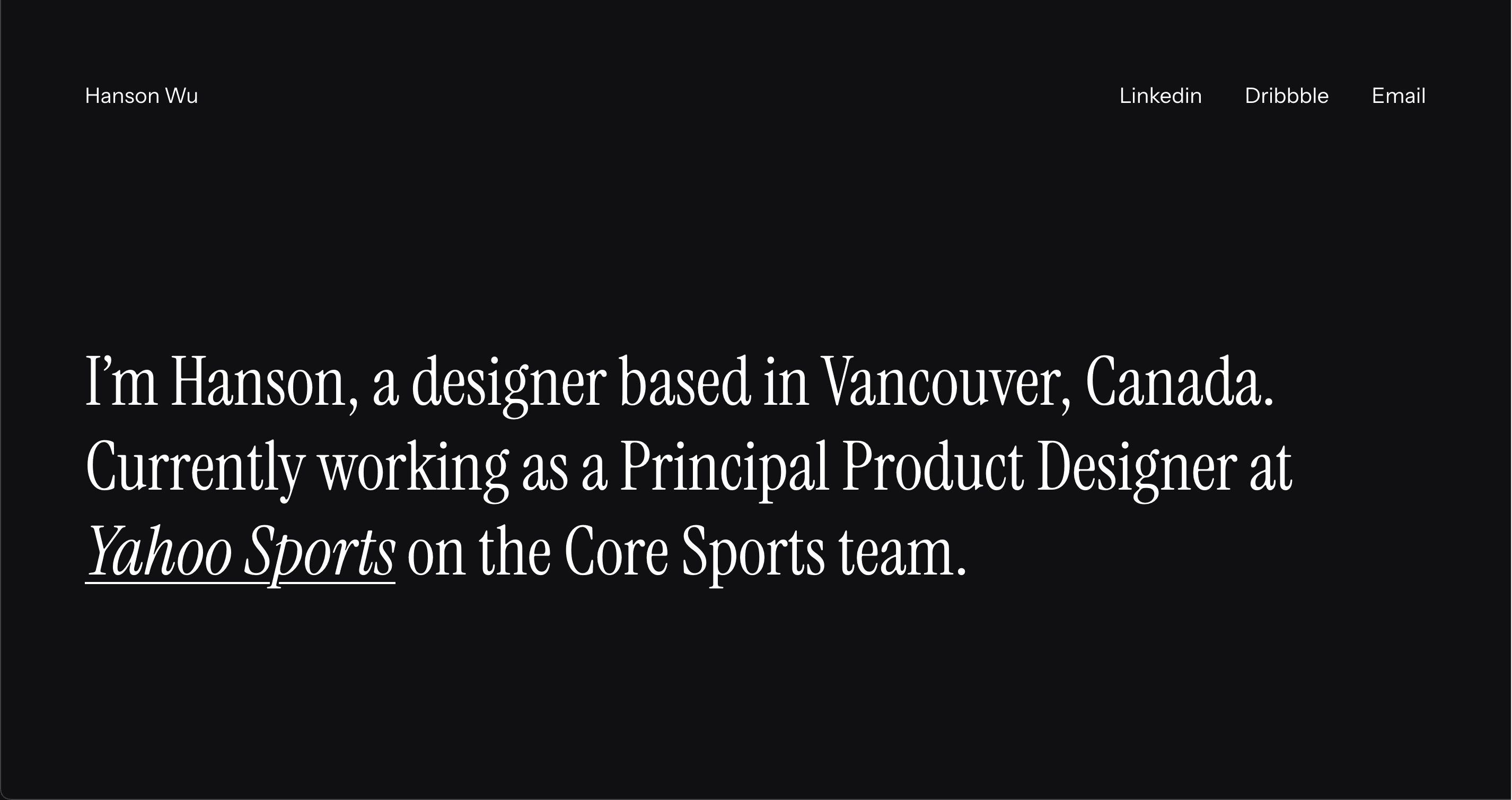 Hanson Wu’s portfolio is a sleek and modern showcase of his principal product design work. The site features a clean layout, bold typography, and a focus on user experience.