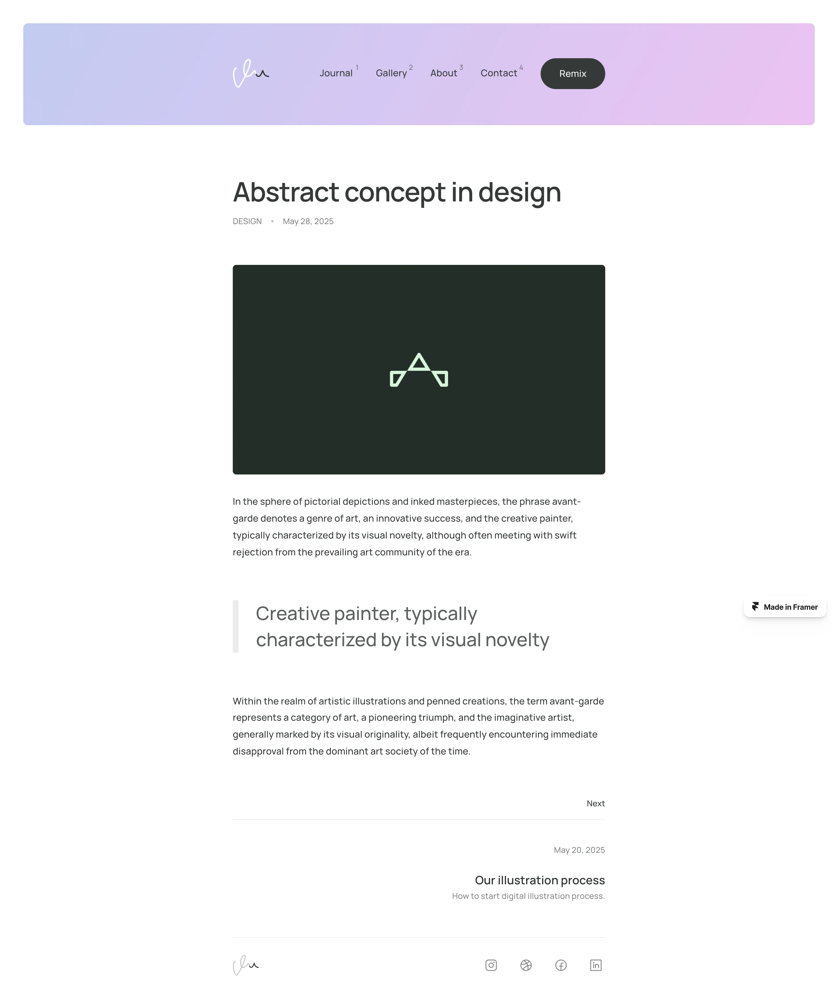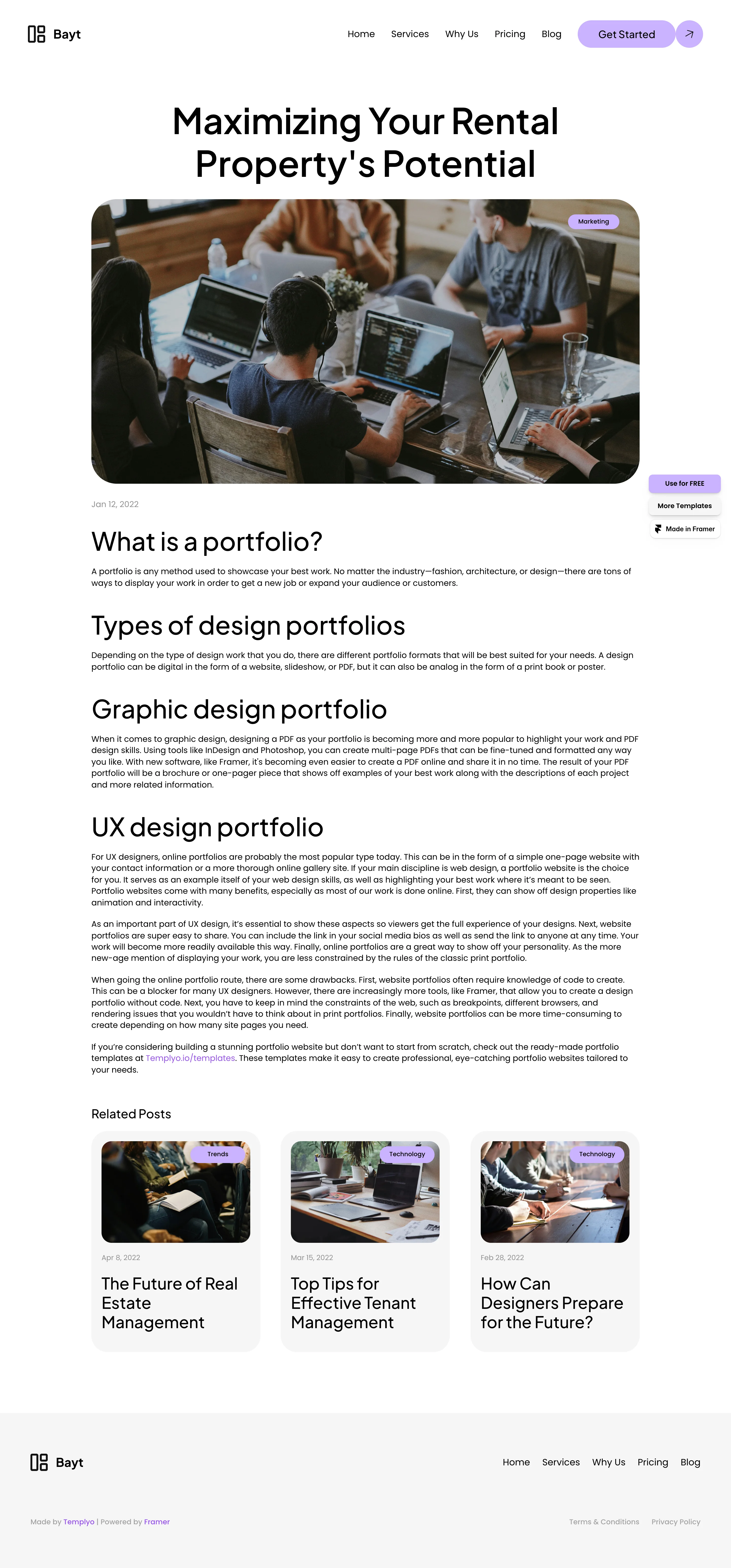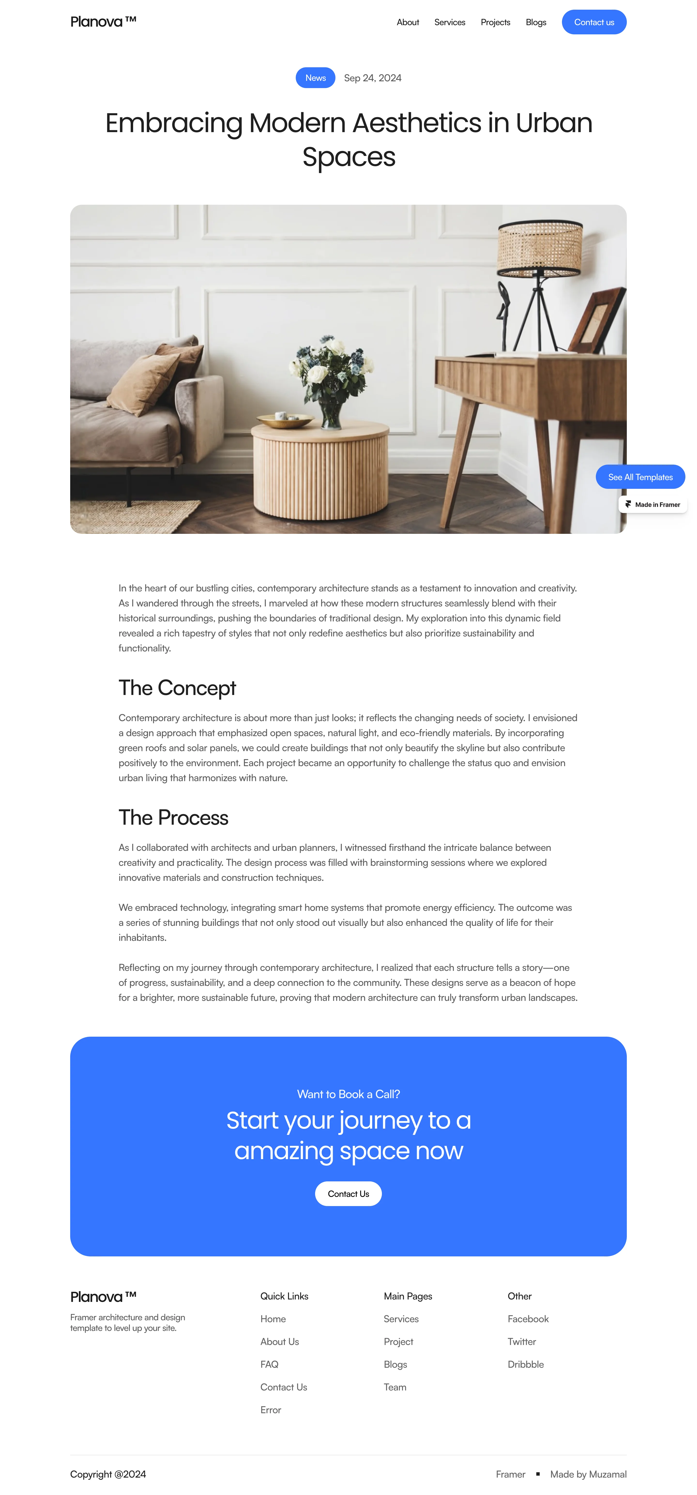 Discover the best free blog post page templates and examples to design individual blog articles and content pages. These free Framer templates are fully customizable and ideal for bloggers, writers, startups, SaaS companies, creators, and content-focused websites. Whether you’re publishing long-form blog posts, tutorials, guides, case studies, news articles, or editorial content, this curated collection of blog post page templates and examples helps you create readable, well-structured pages that improve SEO, engagement, and content clarity.