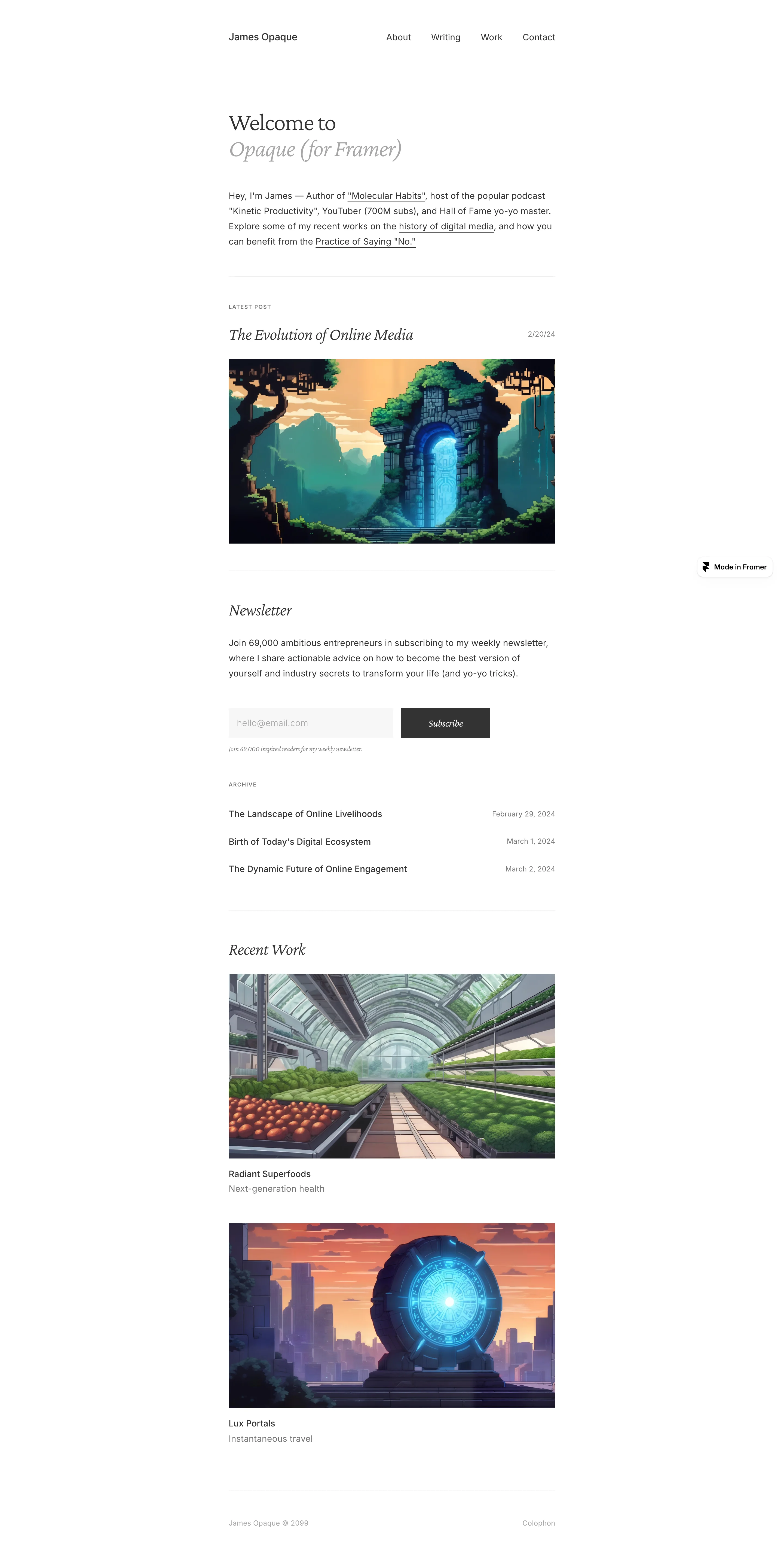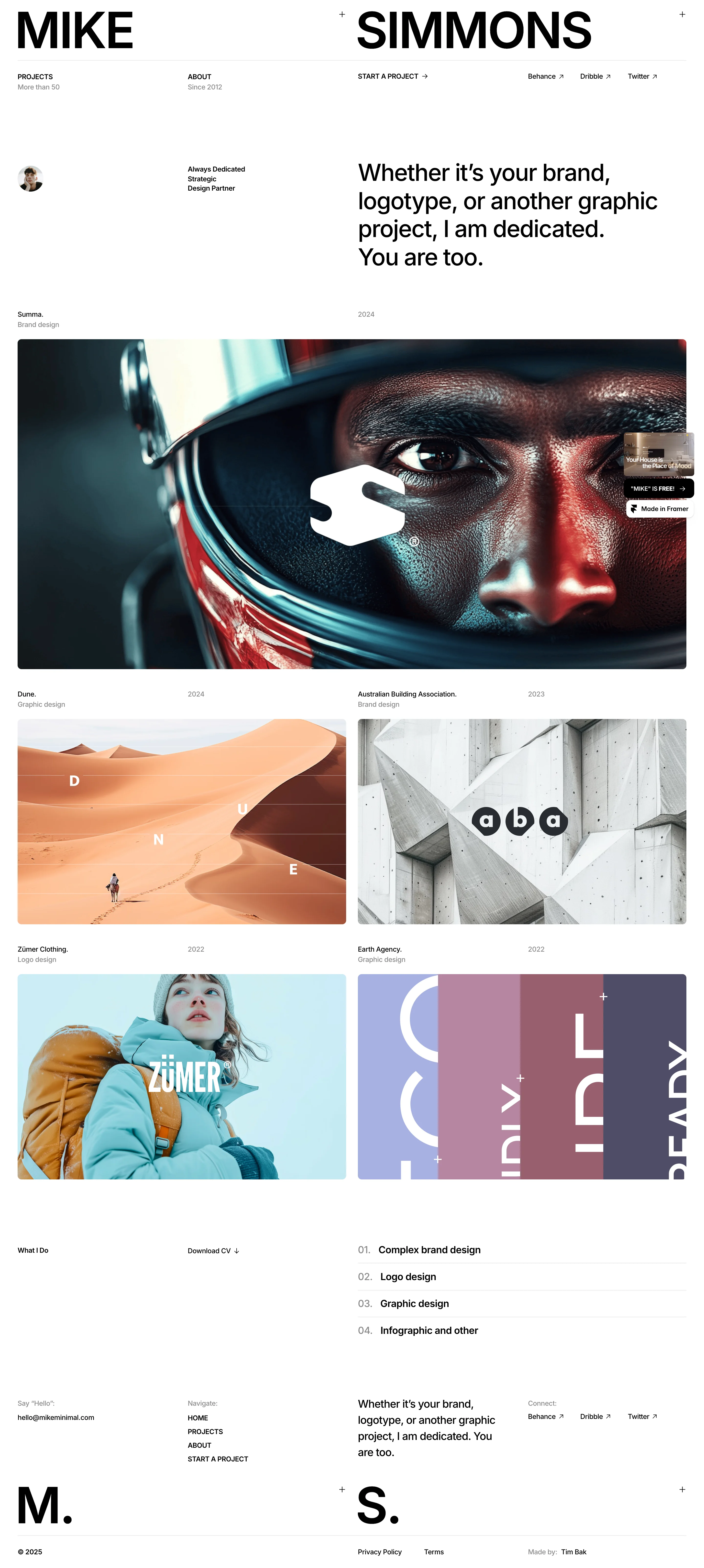 Discover the best portfolio website templates and examples to showcase your work online. These free Framer templates are fully customizable and ideal for designers, photographers, developers, and other creative professionals looking to present their projects with style. Whether you want to highlight design work, photography, code projects, or personal achievements,