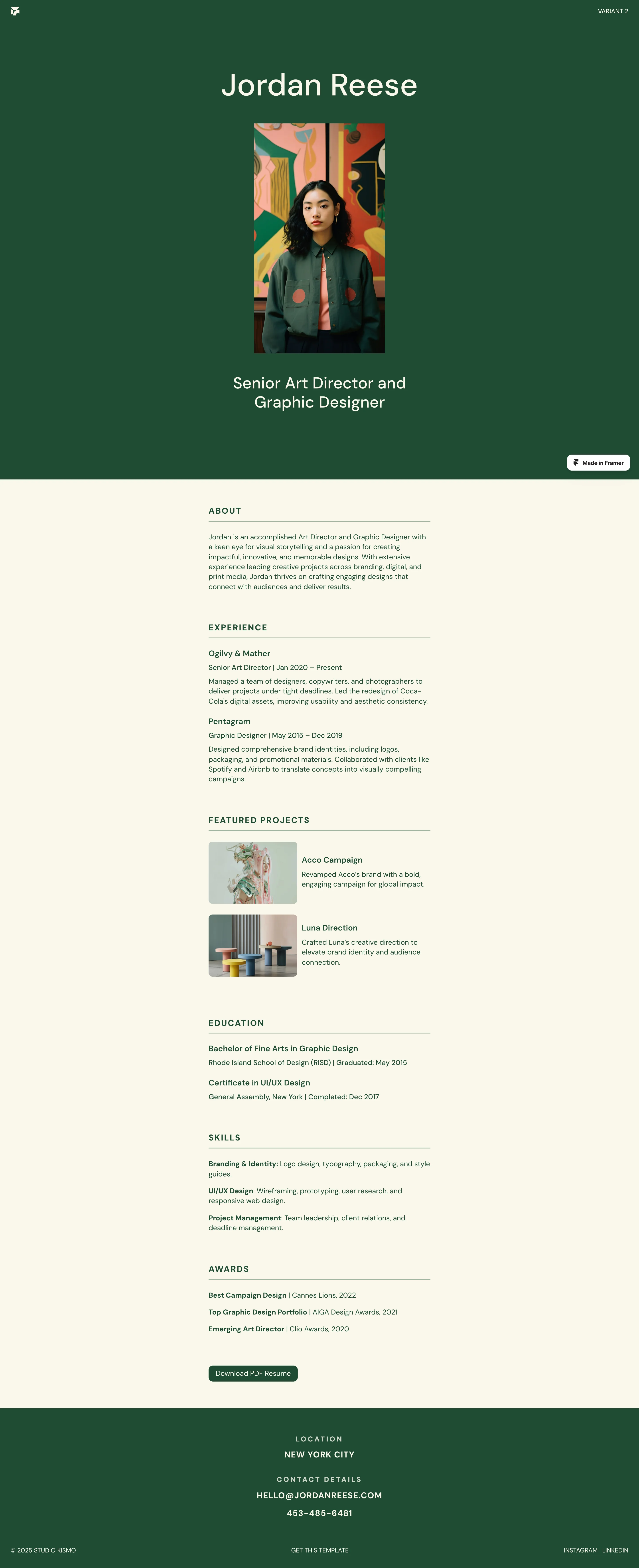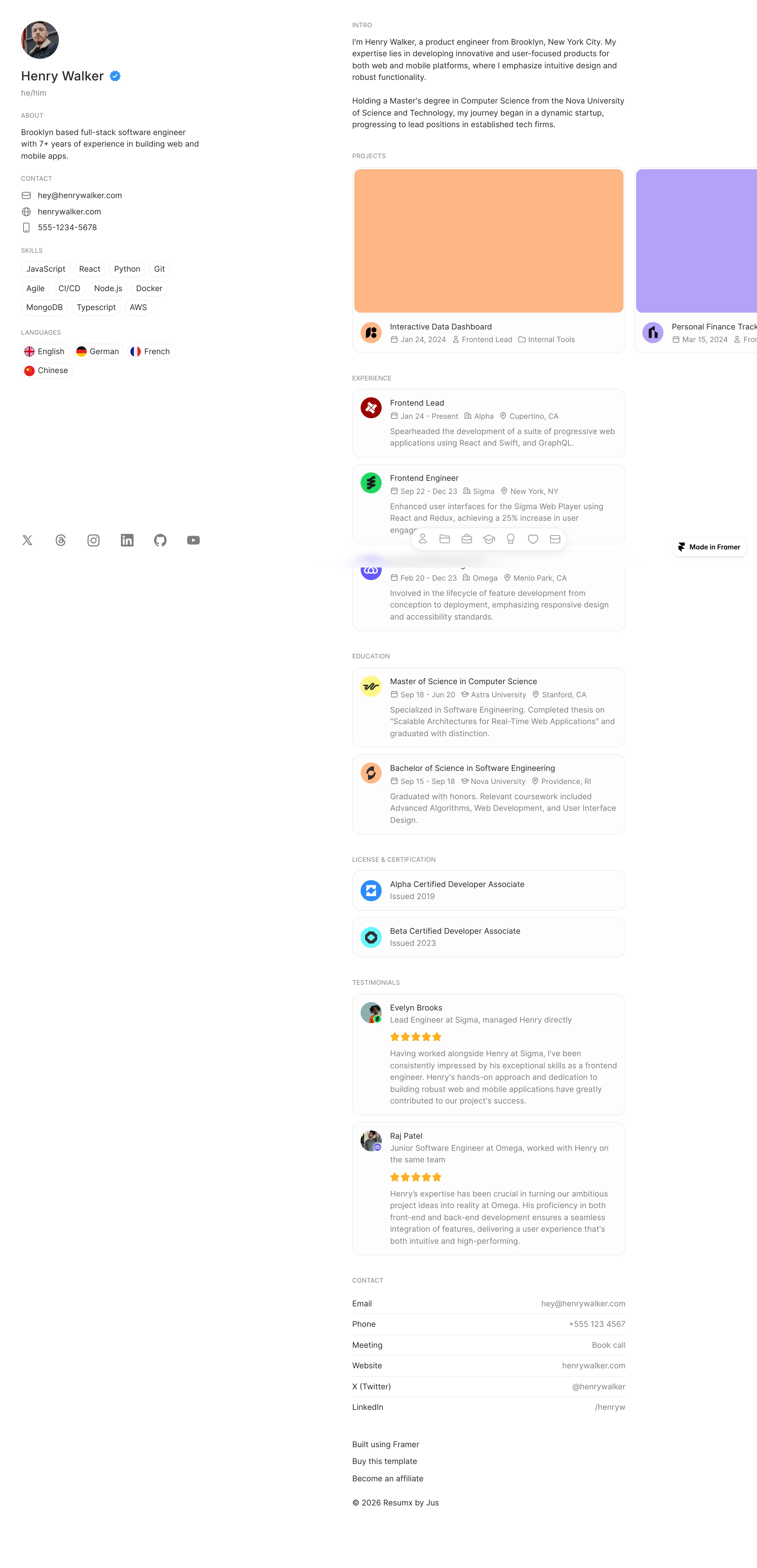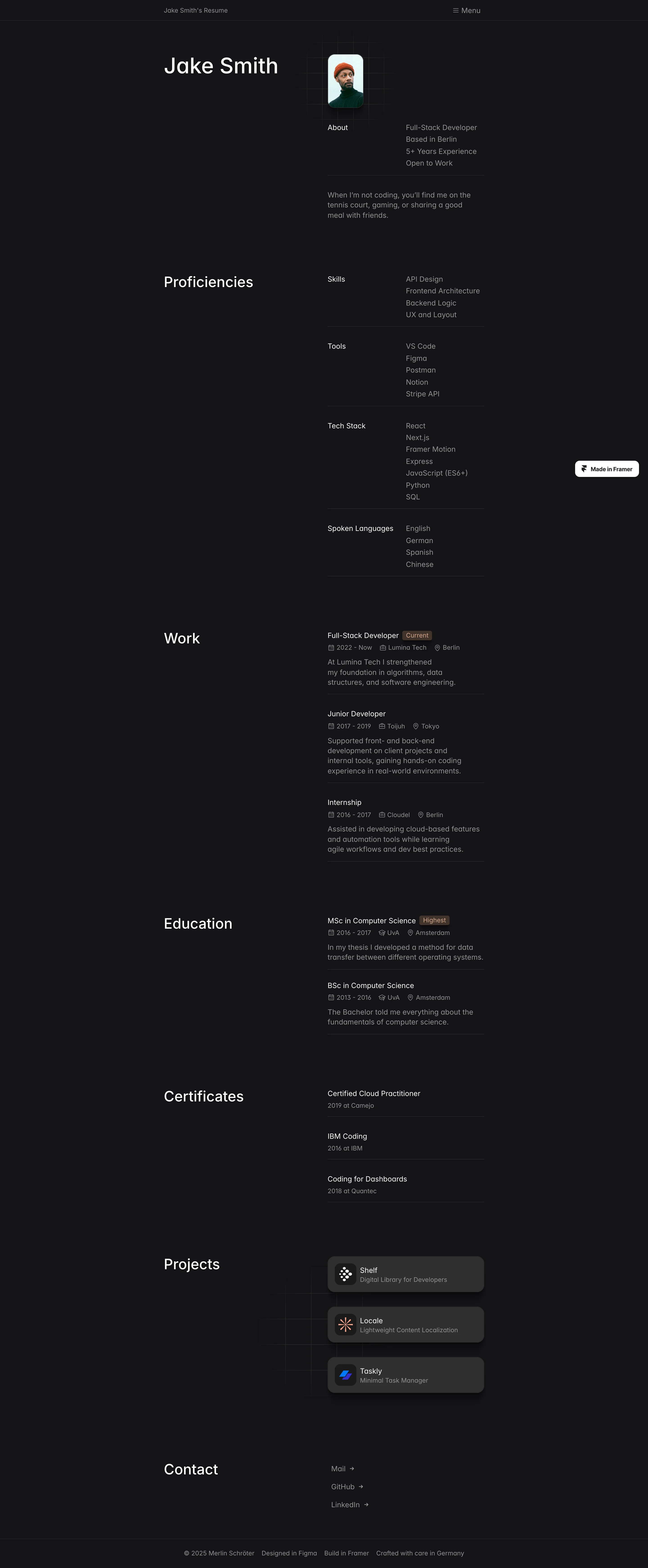 Discover the best free resume website templates and examples to showcase your professional experience and skills online. These free Framer templates are fully customizable and ideal for job seekers, freelancers, designers, developers, and professionals who want to create a modern, professional resume, CV, or personal portfolio website. Whether you want to highlight work experience, skills, education, achievements, or projects, this curated collection provides inspiring examples and ready-to-use templates to help you launch a standout online CV, resume website, or professional profile quickly and easily.