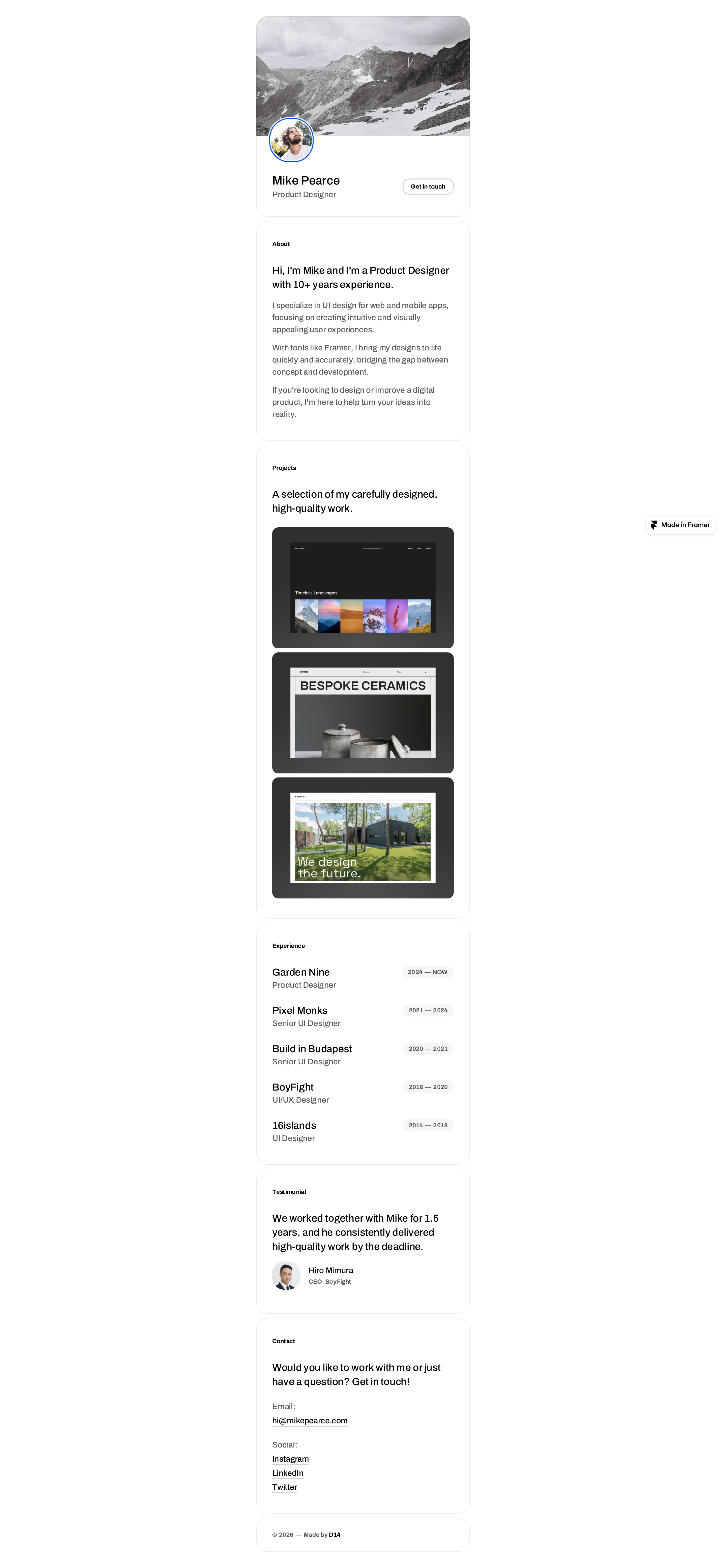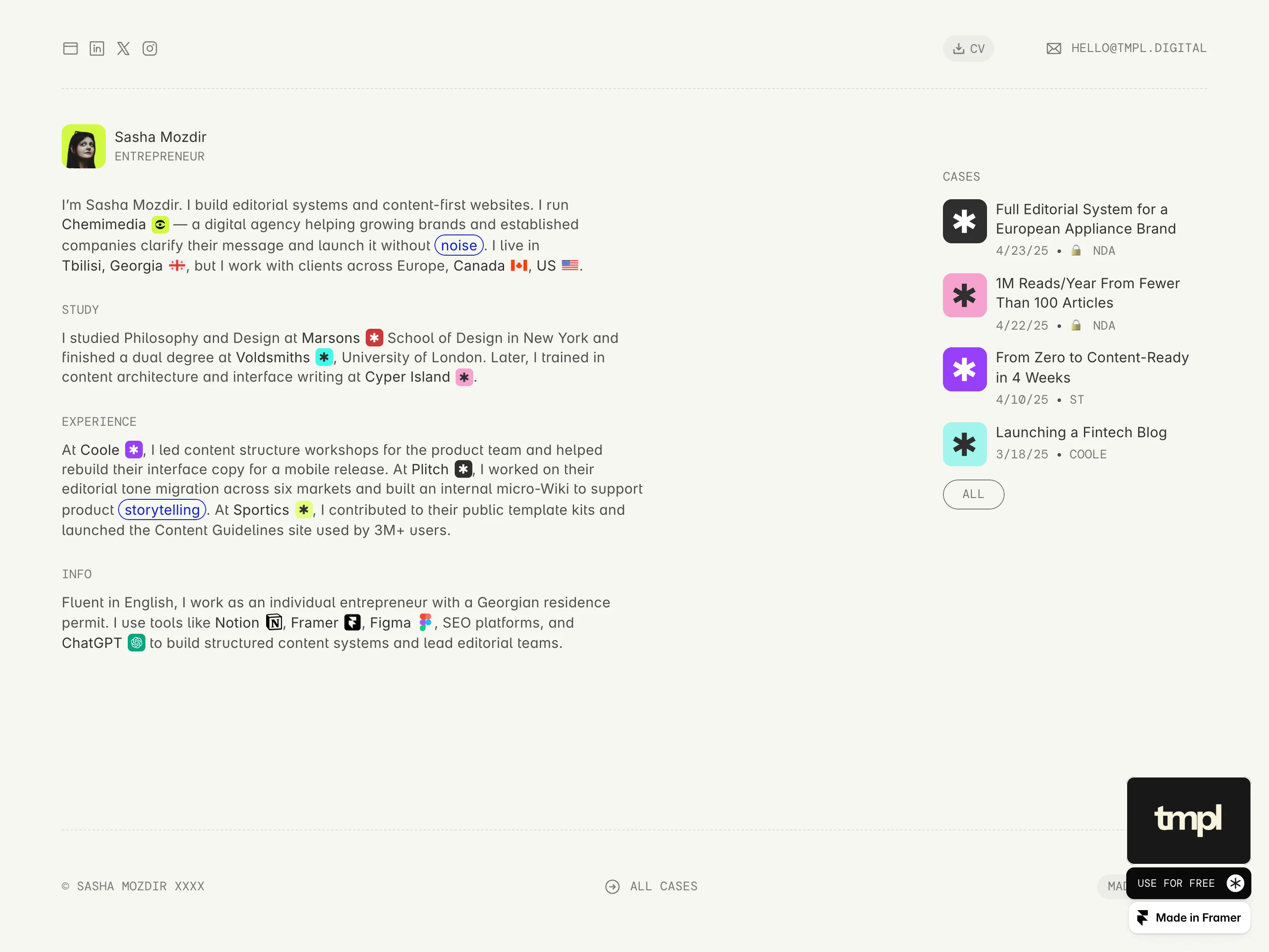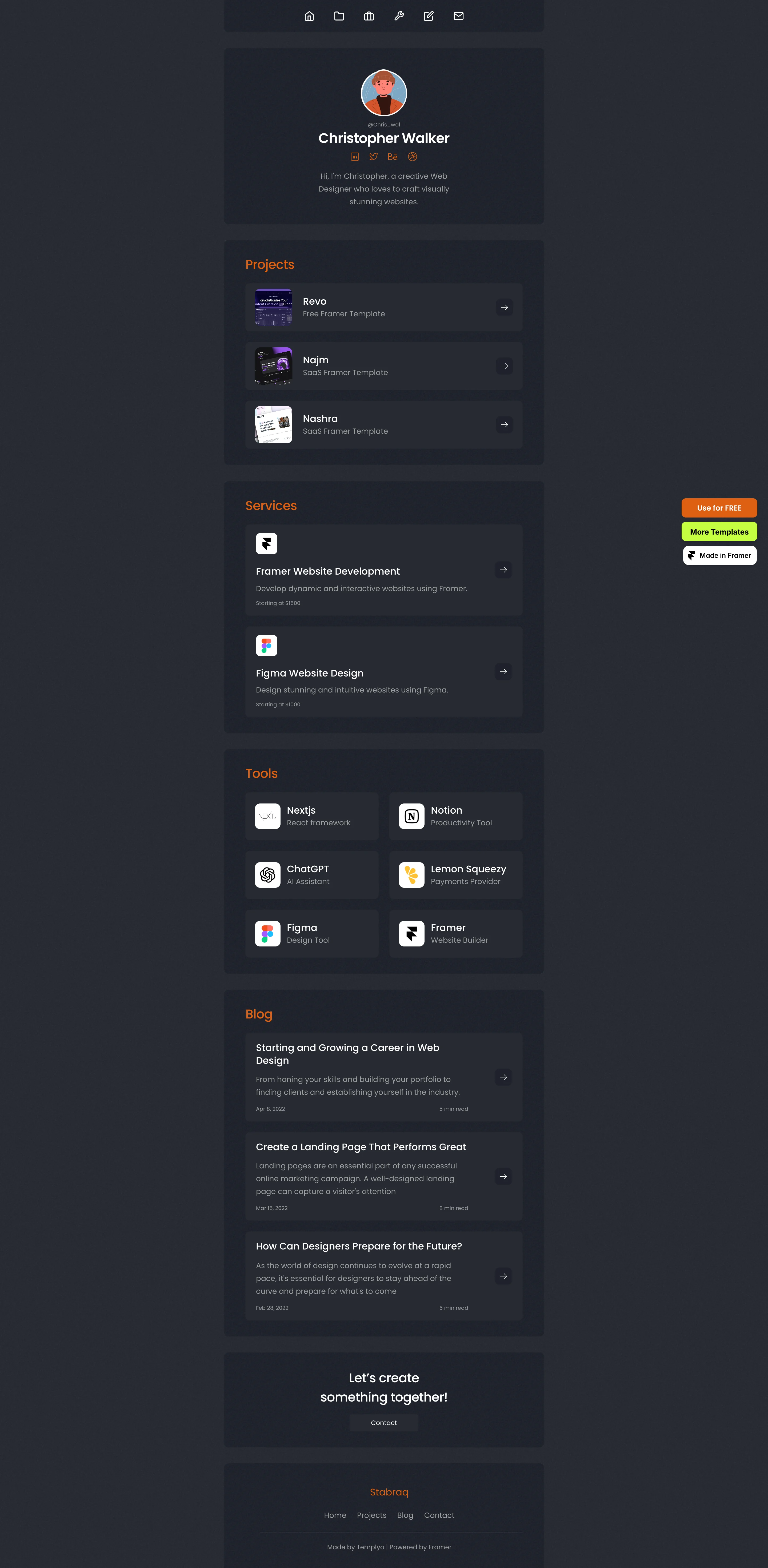 Discover the best free resume website templates and examples to showcase your professional experience and skills online. These free Framer templates are fully customizable and ideal for job seekers, freelancers, designers, developers, and professionals who want to create a modern, professional resume, CV, or personal portfolio website. Whether you want to highlight work experience, skills, education, achievements, or projects, this curated collection provides inspiring examples and ready-to-use templates to help you launch a standout online CV, resume website, or professional profile quickly and easily.