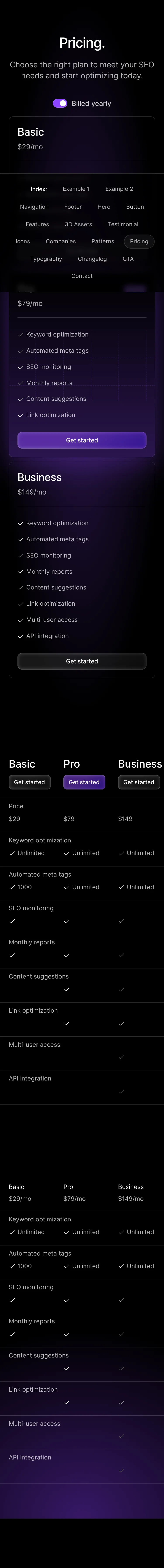The AI Startup Website Kit's pricing page features a clean, user-friendly layout that effectively highlights its plans. With a modern visual style that incorporates ample white space, the design allows for easy navigation and comprehension of pricing tiers.
