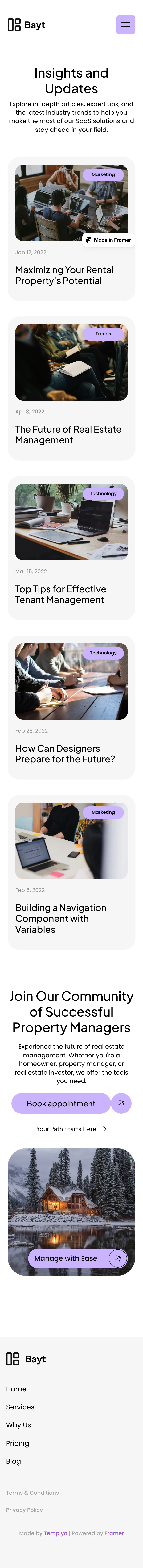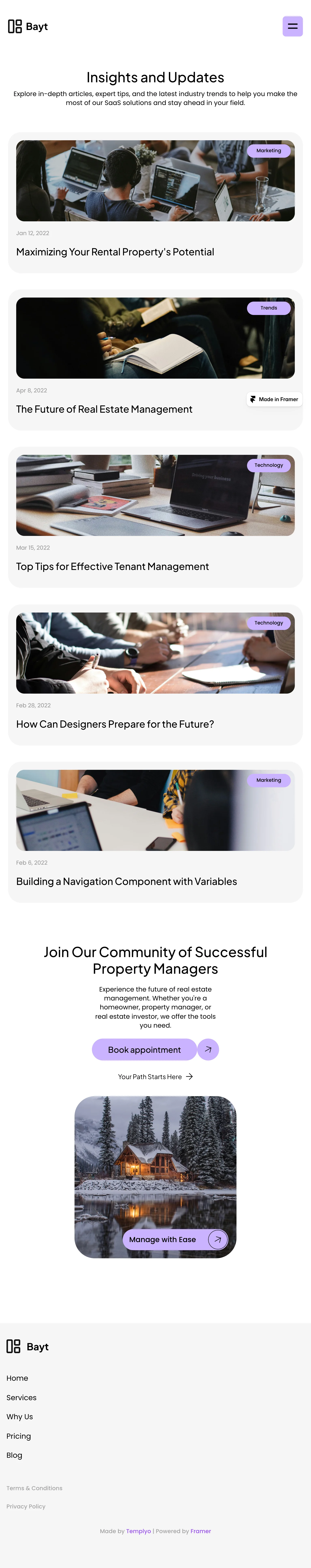 The Bayt blog page features a clean and modern design that emphasizes readability and user engagement. With a well-structured layout, it highlights informative articles on real estate management, marketing, and technology trends.