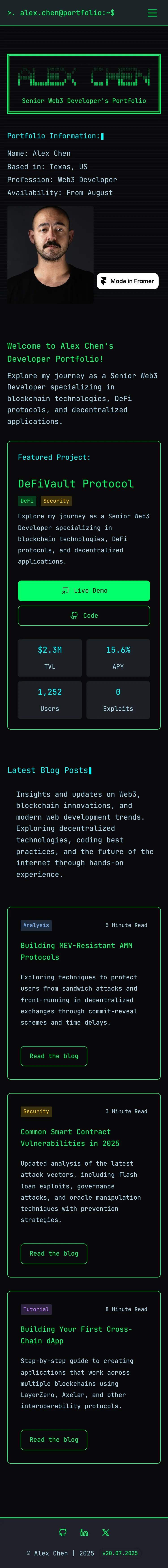 CLIfolio showcases a unique CLI terminal-inspired design that immerses users in a tech-savvy experience. The layout features a clean, monochromatic aesthetic with interactive elements that mimic command-line inputs.