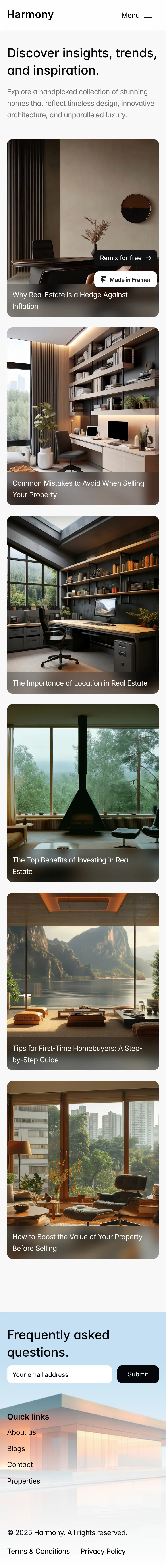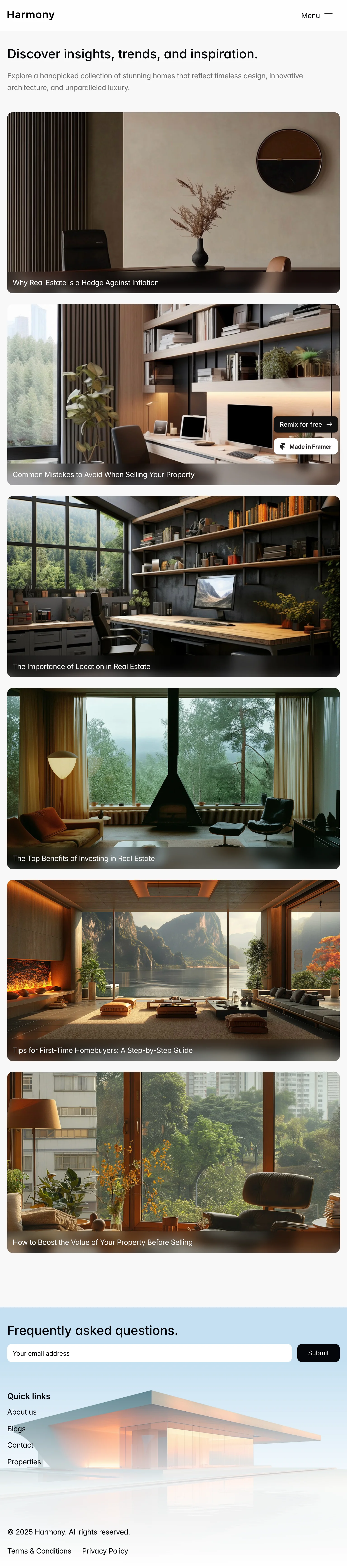 The Harmony blog page showcases a clean, modern design that emphasizes readability and user engagement. Its elegant layout features a minimalist aesthetic with ample white space, allowing vibrant images of luxurious properties to shine.