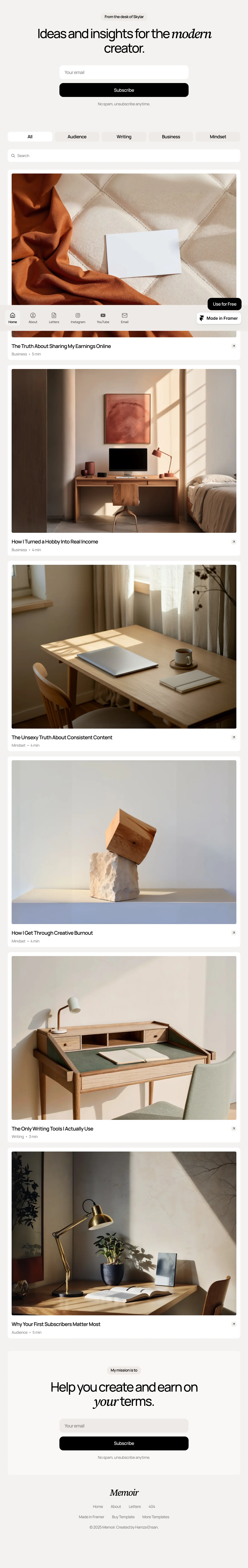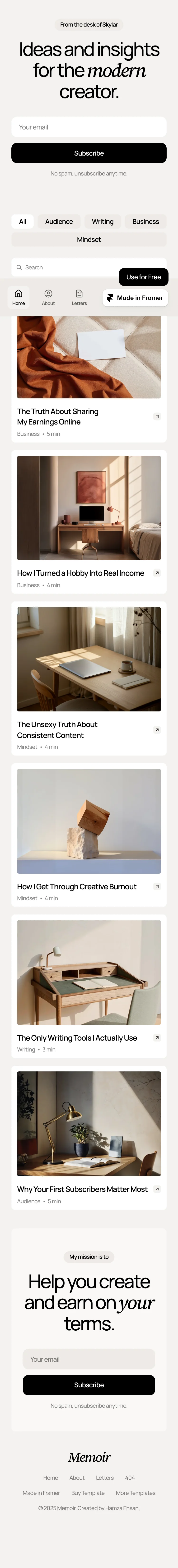 The Memoir homepage features a clean and modern design, with a minimalist layout that emphasizes content clarity. A sophisticated typography hierarchy guides users through sections, while ample white space enhances readability.
