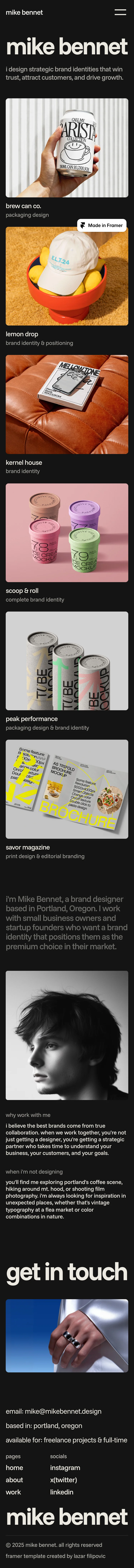 The homepage of Mike Bennet's portfolio is a clean, modern showcase of brand identity design. Its minimalist layout features ample white space, enhancing readability and focus on content. Bold typography and engaging visuals highlight his work with small businesses.