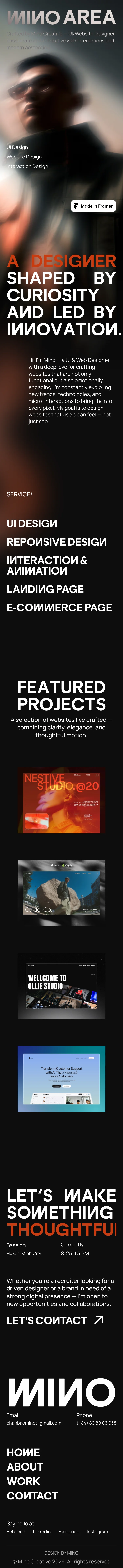 The Mino Area homepage showcases a modern, minimalist design that emphasizes clarity and emotional engagement. With a clean layout featuring ample white space, the site utilizes bold typography and subtle animations to enhance user interaction.