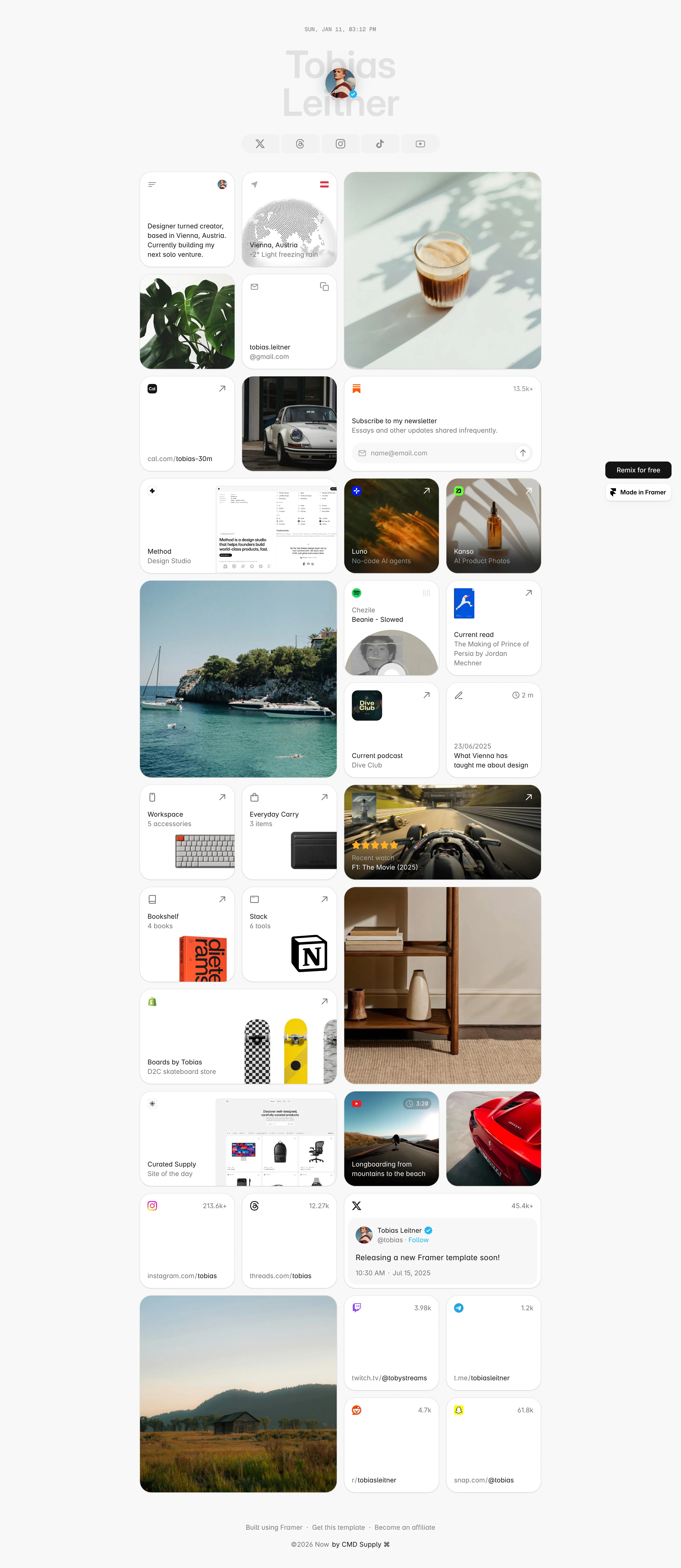 The homepage of "Now" is a sleek, modern showcase that blends minimalist aesthetics with vibrant visuals. Its layout is intuitive, featuring a prominent designer bio and engaging sections that highlight projects and resources.