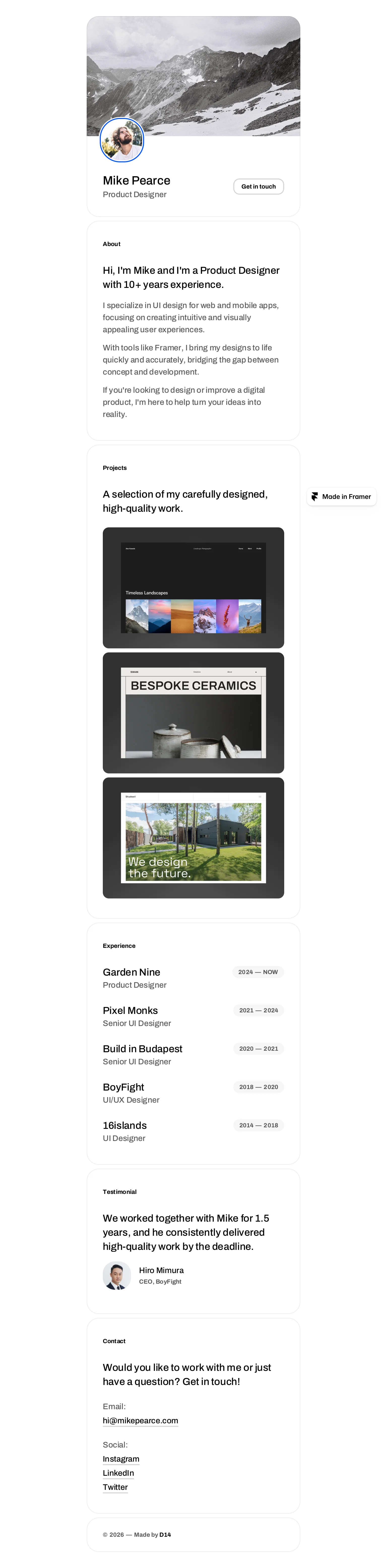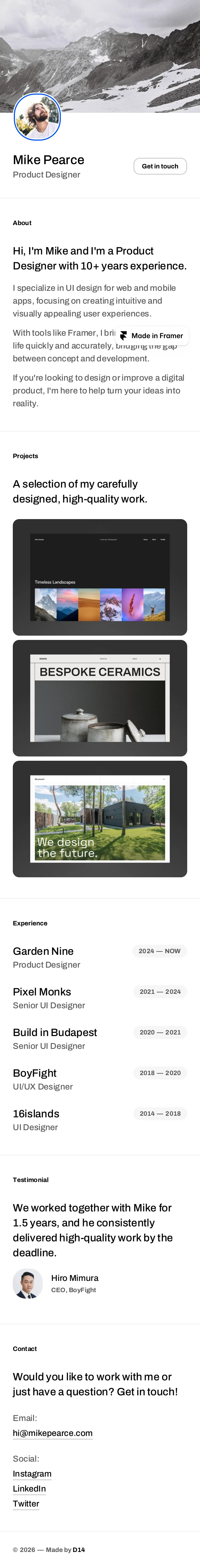 The Pearce homepage features a clean and modern aesthetic, showcasing Mike Pearce's expertise in product design. Its minimalist layout emphasizes essential content, with intuitive navigation and engaging visuals.