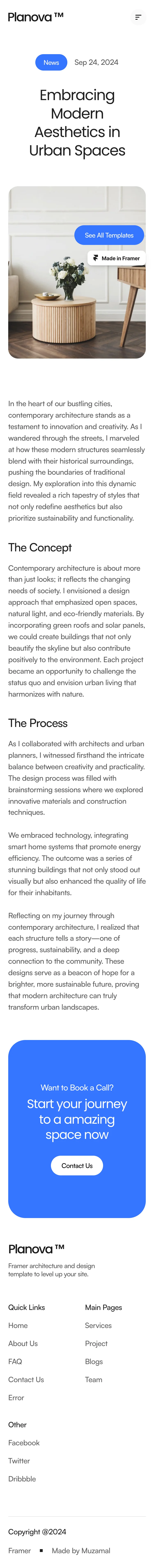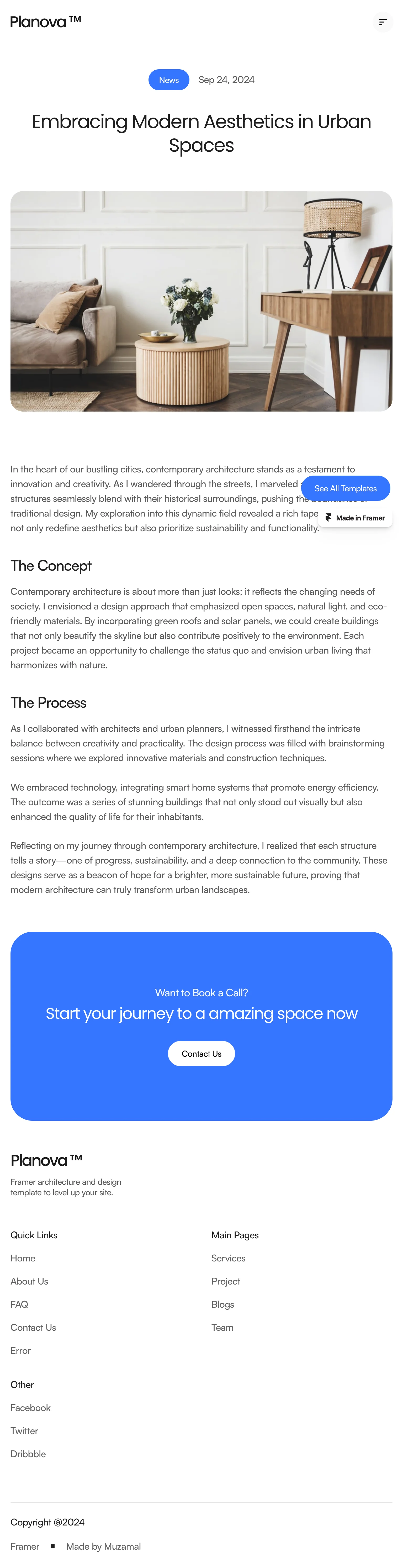 The Planova blog post "Embracing Modern Aesthetics in Urban Spaces" showcases a visually striking layout, blending contemporary design elements with engaging content. The clean typography and ample white space enhance readability, while vibrant images of urban architecture inspire creativity.