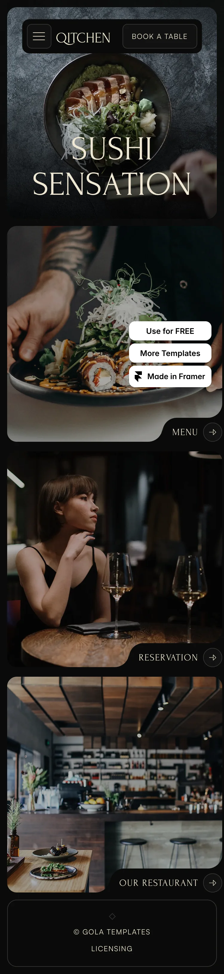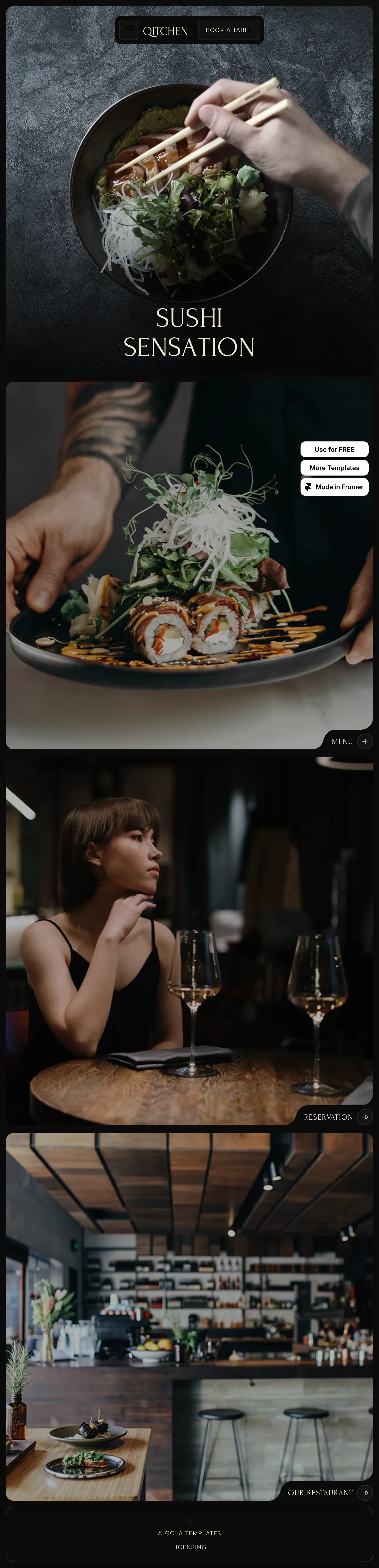The Qitchen homepage boasts a sleek, modern design characterized by a minimalist aesthetic and a harmonious color palette. The intuitive layout features easily navigable sections for the menu, about, and reservation options, enhancing user experience.