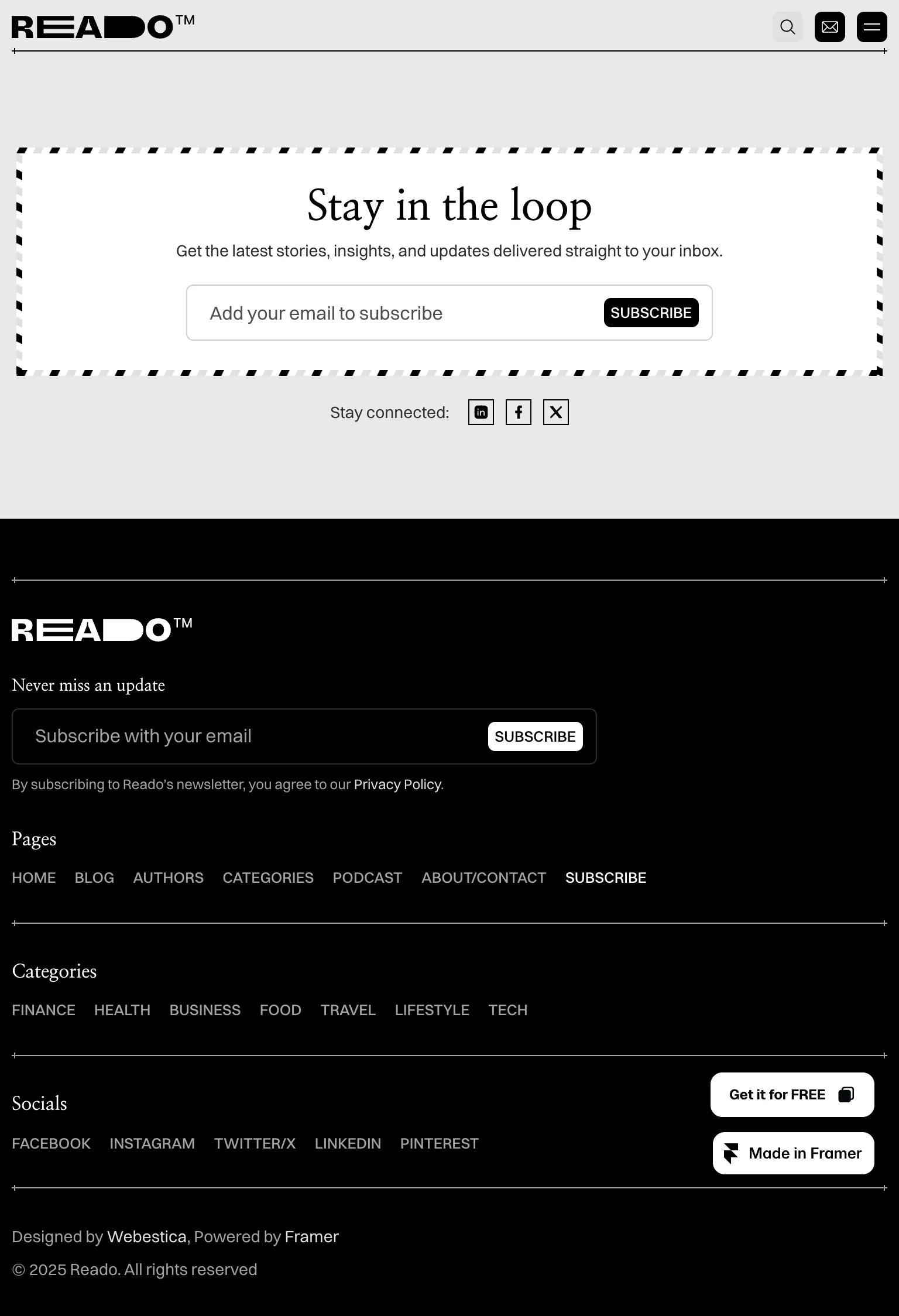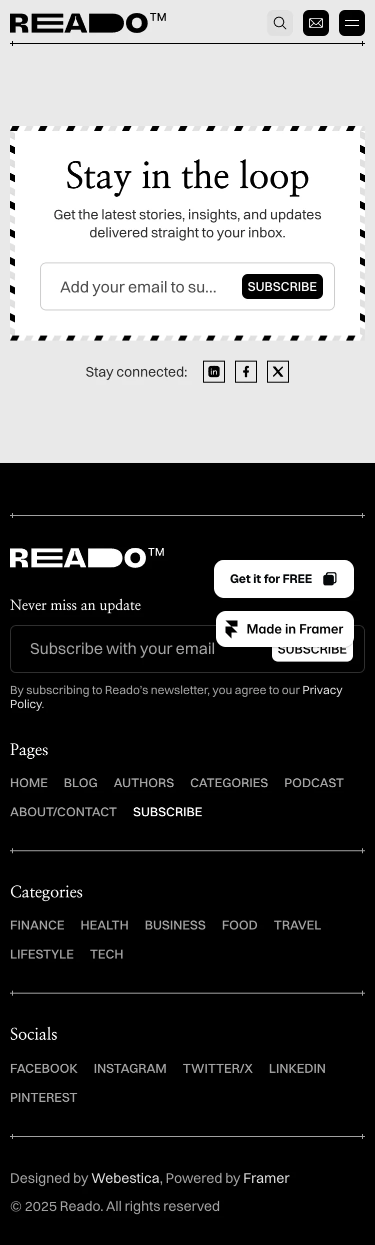 The Reado pricing page boasts a clean, modern design that emphasizes simplicity and clarity. The layout is user-friendly, featuring a prominent subscription call-to-action that encourages engagement. With a minimalistic color palette and ample white space, the visual style is fresh and inviting, ens