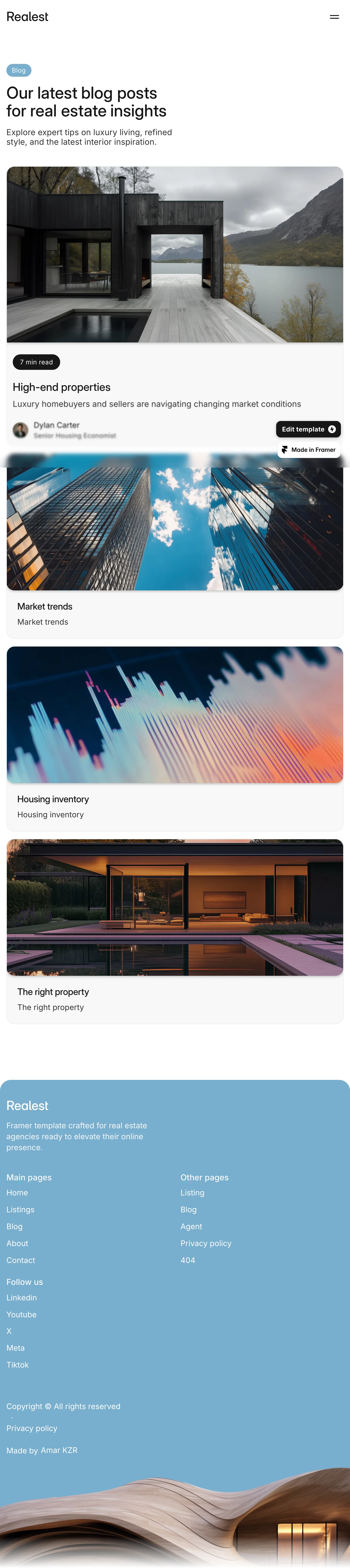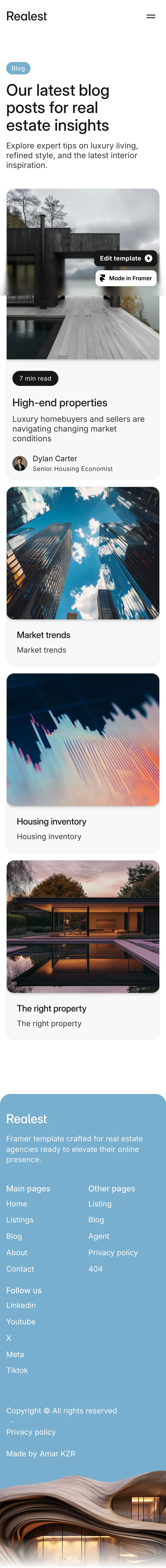 The Realest blog page showcases a sleek, modern design tailored for real estate insights, featuring a clean layout that enhances readability. Bold typography and a muted color palette create an elegant atmosphere, while strategic use of imagery complements the content.