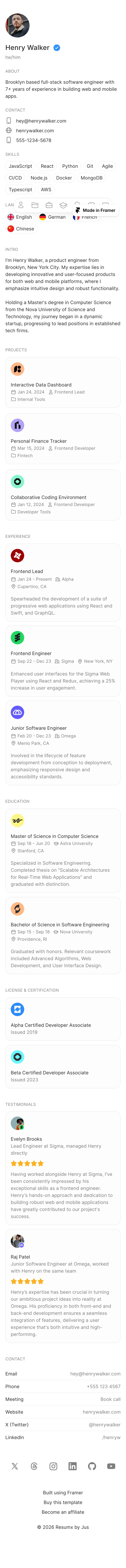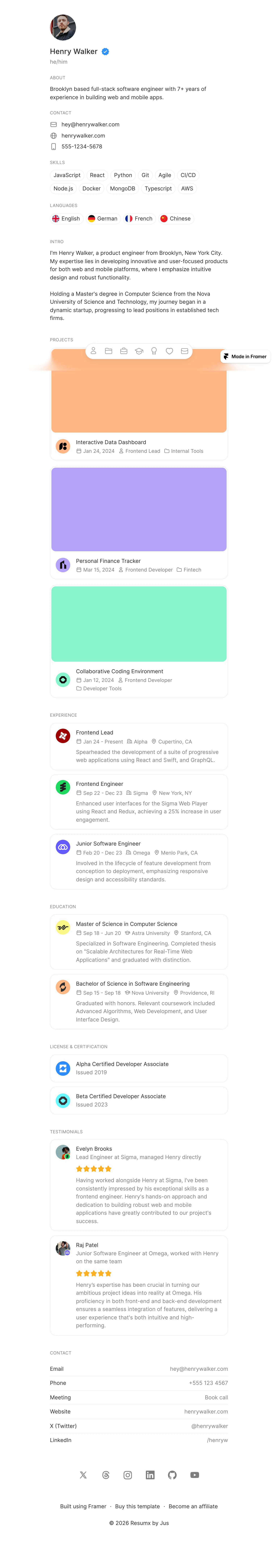The Resumx homepage features a sleek and modern design that highlights Henry Walker's professional journey as a full-stack software engineer. With a clean layout and intuitive navigation, the page effectively showcases his skills, experience, and projects.