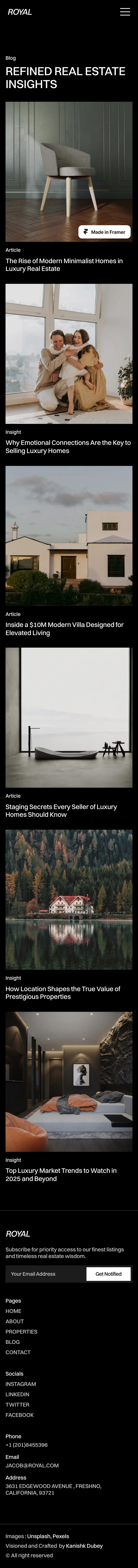 The Royal blog page showcases a sleek, modern design that emphasizes refined aesthetics and user-friendly navigation. With a minimalist layout, it features high-quality images and concise articles on luxury real estate, creating an inviting reading experience.