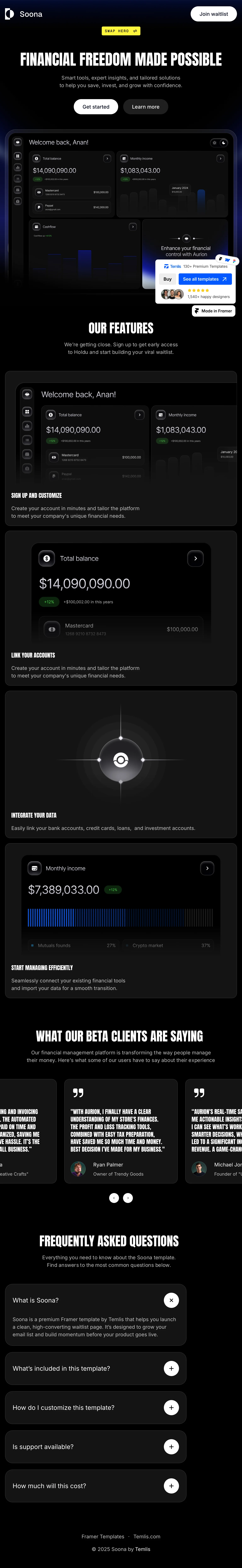 The Soona homepage features a sleek, modern design that emphasizes financial freedom through engaging visuals and concise messaging. The layout is intuitive, guiding users seamlessly through smart tools and insights.